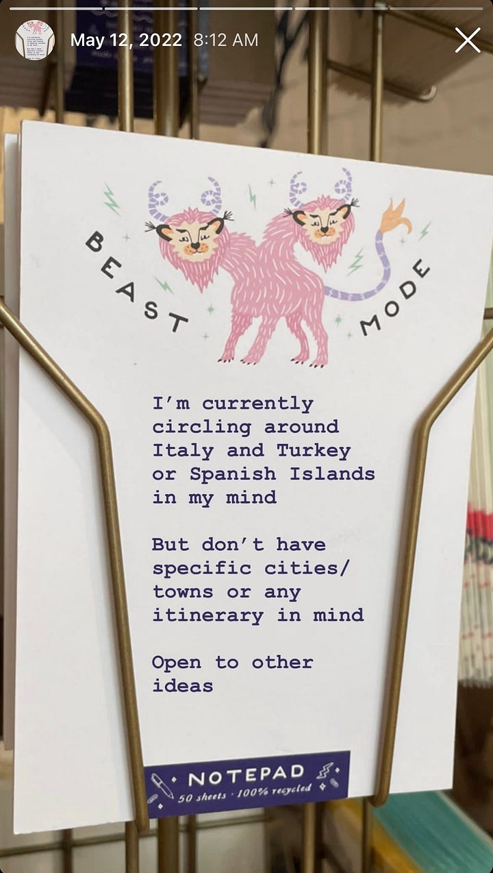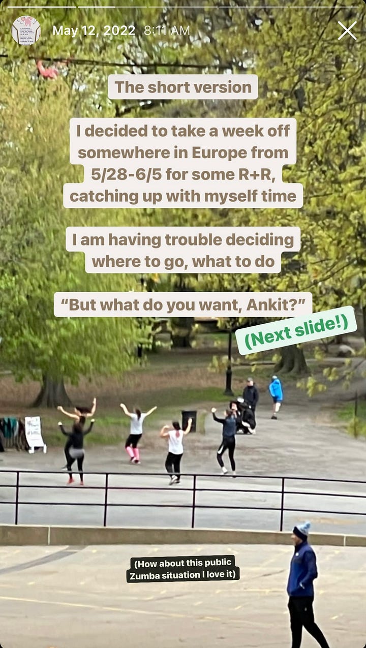 Almost a year later, I had another, “Ankit, use your PTO” conversation. This time, I looked to Instagram for inspiration—and with a marginally clearer sense of what I was looking for (progress!)